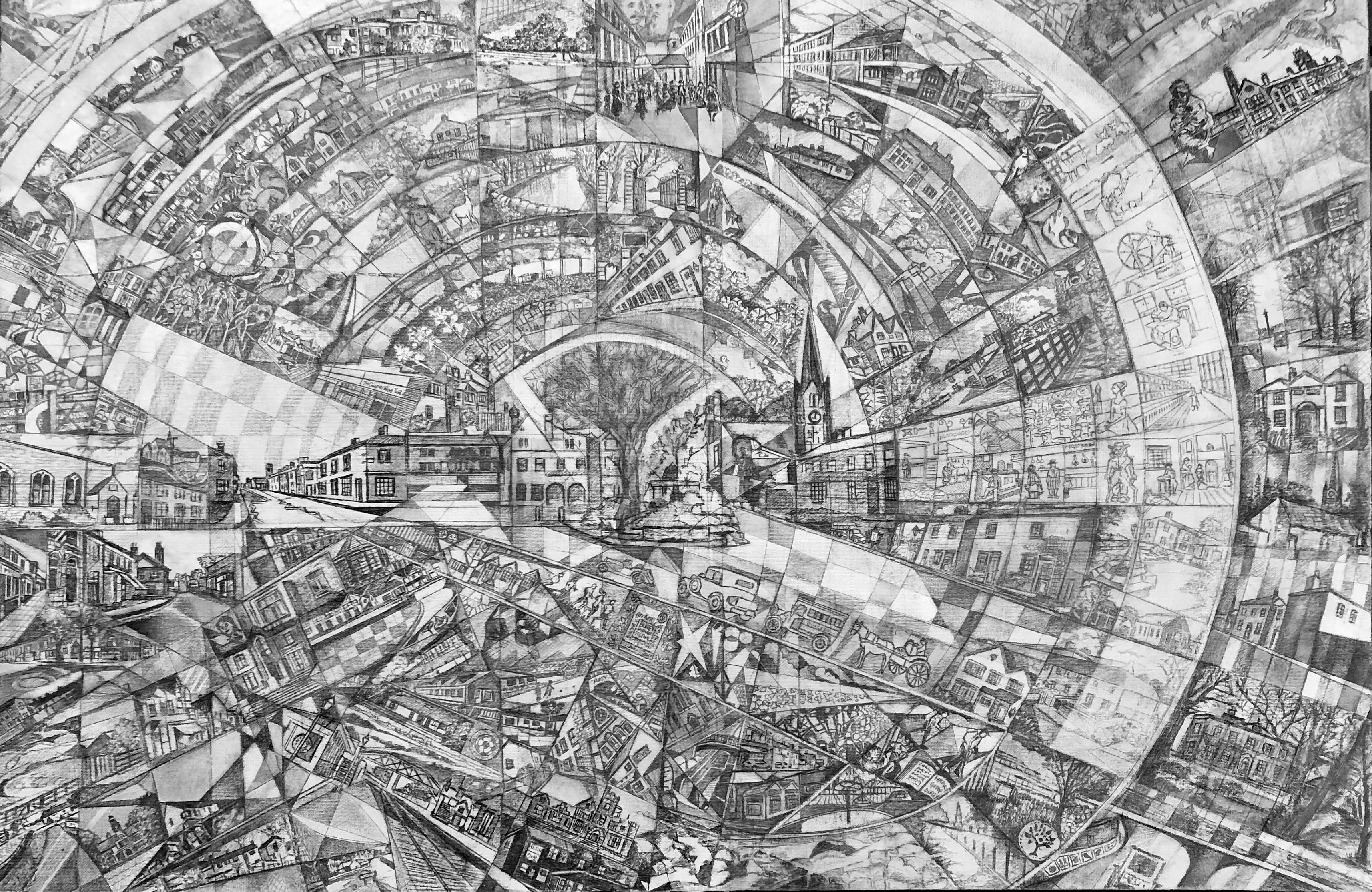 He’s brought out the tonal shade of the sectional part of the spinning wheel, a symbol of Burley’s heritage, muting but recognisable icons by applying white spirit to soften the marks. It shows how the wheel will contain also the historical trades etc.